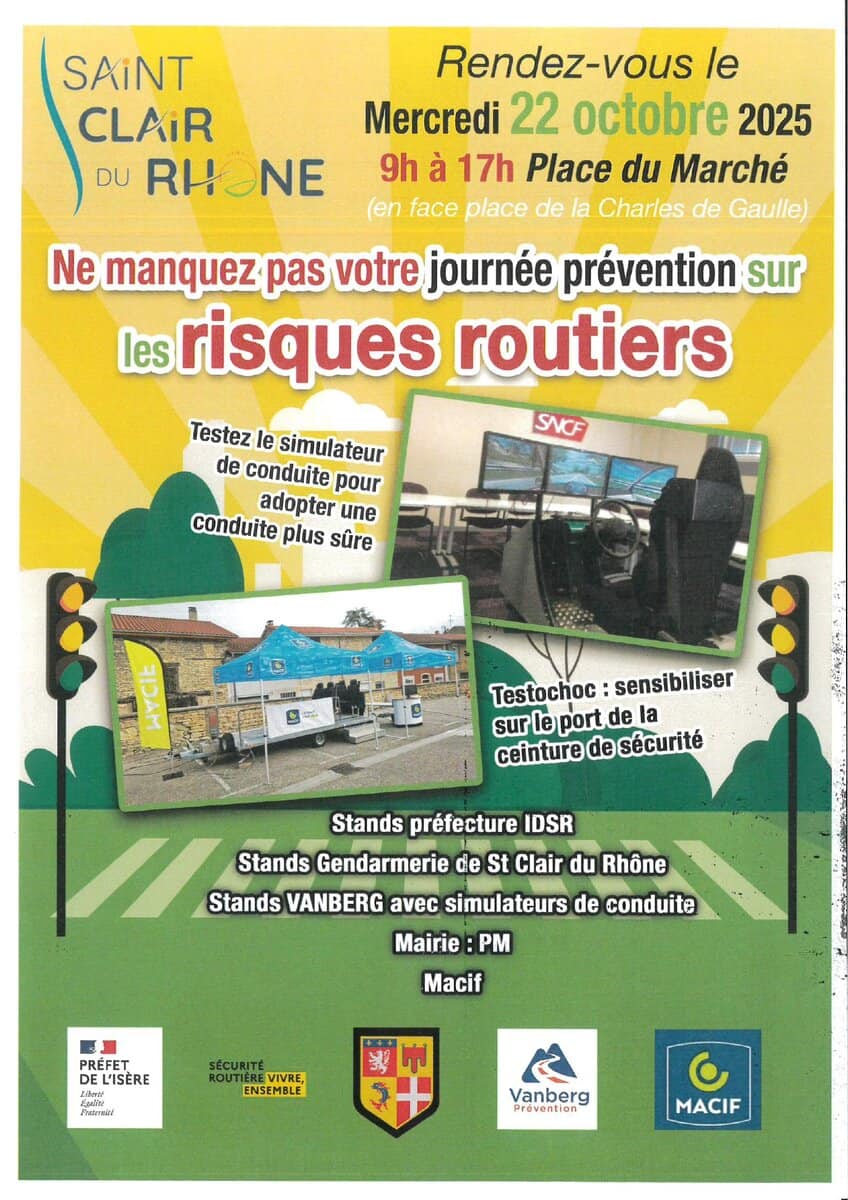 Mercredi 22 octobre de 9h00 à 17h00 sur la place du marché de Saint-Clair-du-Rhône : Journée prévention sécurité routière.