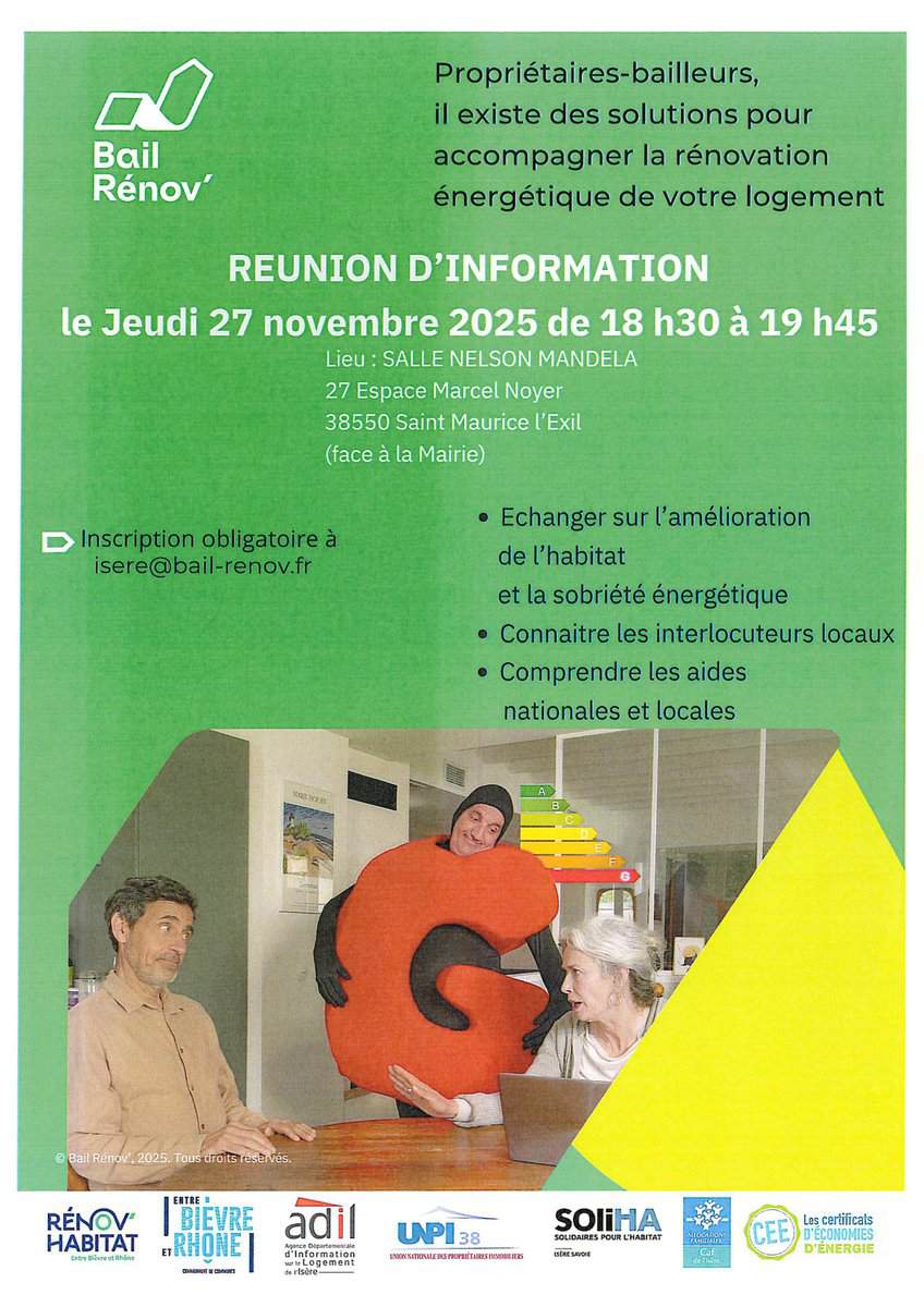 Propriétaires-bailleurs, il existe des solutions pour accompagner la rénovation énergétique de votre logement : Réunion d'information le jeudi 27 novembre 2025 de 18h30 à 19h45 à la salle Nelson Mandela à saint-Maurice-l'Exil. Inscription obligatoire à isere@bail-renov.fr