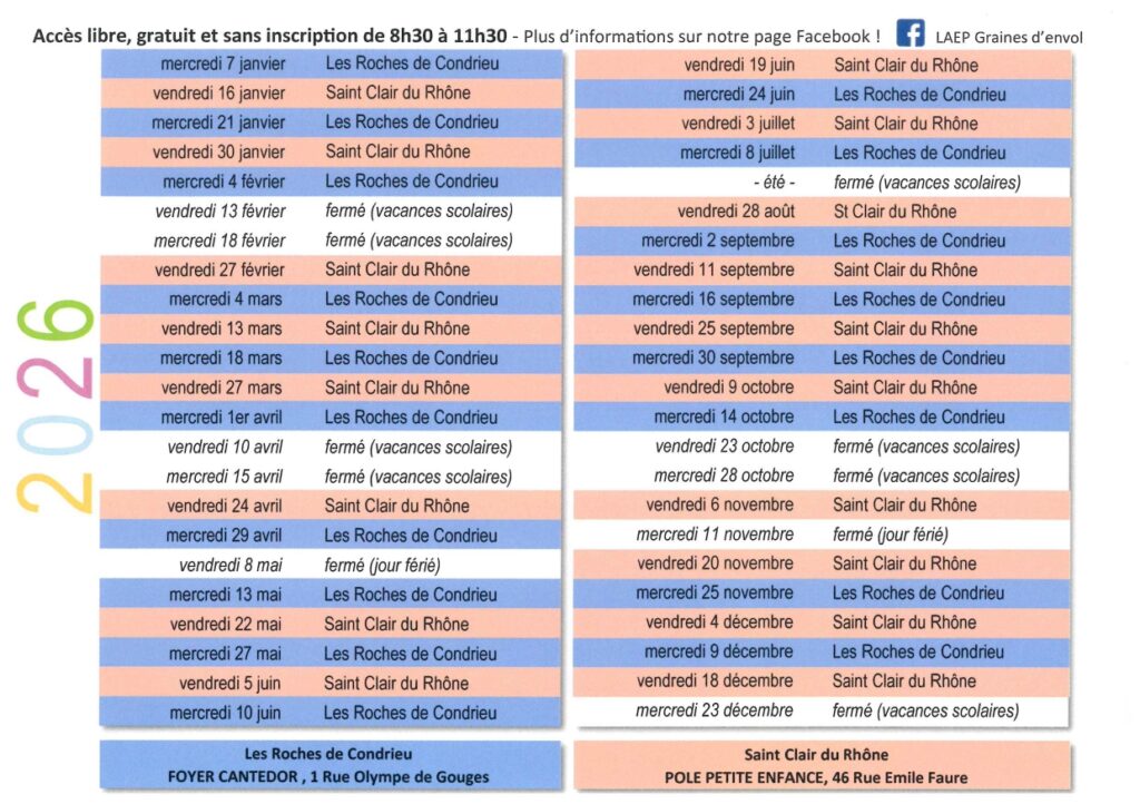 - Les vendredis impairs au Pôle Petite Enfance (46, rue Emile Faure 38370 Saint-Clair-du-Rhône).